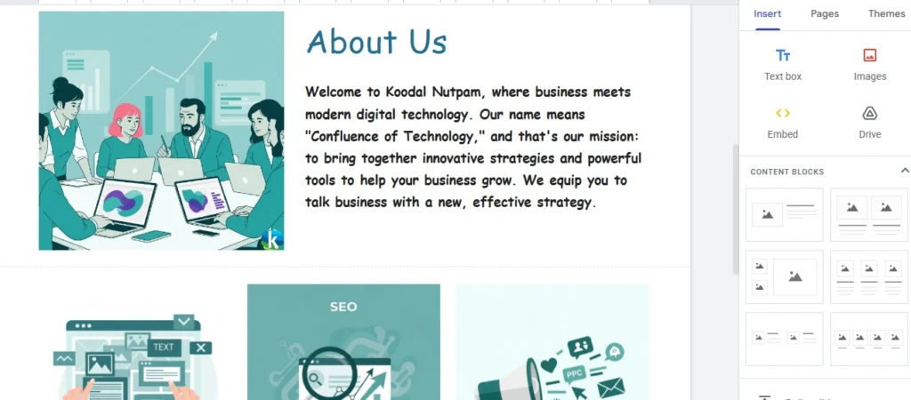 sites.google.com/view/koodalnutpam. - வெளியீடு: ‘Publish’ என்பதை மீண்டும் கிளிக் செய்தால், வாழ்த்துக்கள்! உங்கள் வெப்சைட் இப்போது ஆன்லைனில் நேரலையில் இருக்கிறது. அதன் இணைப்பை (Link) காப்பி செய்து, உங்கள் நண்பர்கள், வாடிக்கையாளர்கள் மற்றும் சமூக ஊடகங்களில் பகிரலாம்.